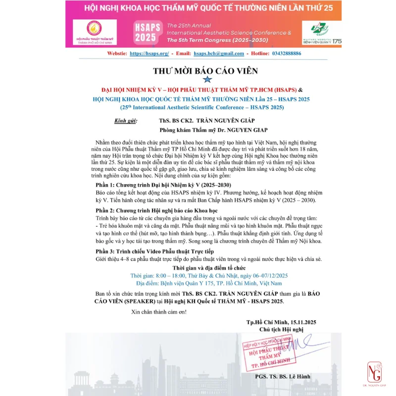 Sự hiện diện của bác sĩ tại HSAPS 2025 không chỉ là một dấu mốc nghề nghiệp mà còn là sự ghi nhận cho hành trình nghiên cứu bền bỉ, tâm huyết y khoa và cam kết nâng cấp tiêu chuẩn an toàn thẩm mỹ tại Việt Nam.